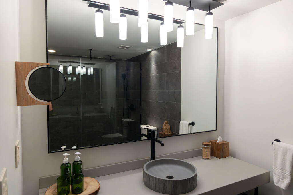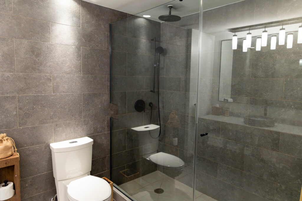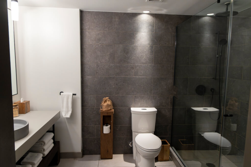 As you can see in the above photo, the shower controls are right under the shower, opposite the door. Usually, I’m not a fan of this setup, as it results in getting blasted with cold water. But, at the 1 Hotel SF, there’s a hole cut into the shower stall glass panel that lets you turn the water on from the outside of the shower stall. Fortunately, this feature didn’t result in the toilet getting wet while we showered.