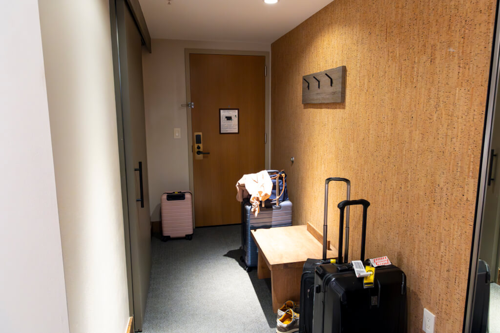 Entering the room, you’re greeted by a bare wood wall with a wooden bench and coat rack on one side, and the bathroom on the other.