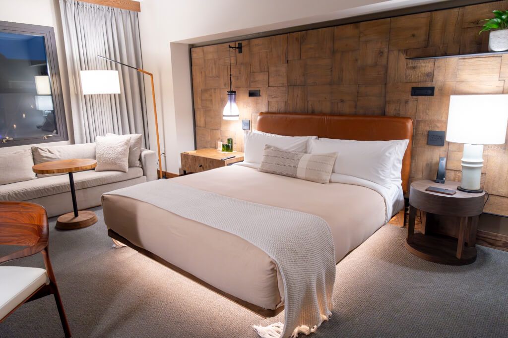 Beyond the bathroom, the main portion of the room was decently sized. Here, you see a king-size bed up against a leather headboard, which itself is up against a wood feature wall. Two nightstands flank the bed, with a large sofa just under the window.