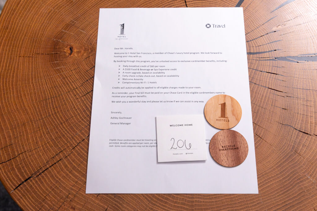 Upon check-in, I was provided with a letter from the property manager just for Chase guests, explaining our benefits. Moreover, I was offered an upgrade to a waterfront room, up from the base-level room I had originally booked. My room keys were also issued, which are wood disks.