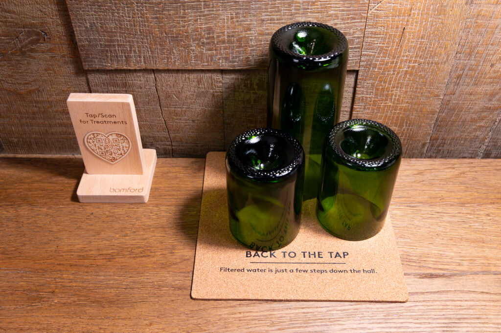 Recycled wine bottles make up the in-room drinking glasses on the left nightstand, and a cordless phone on the right one.