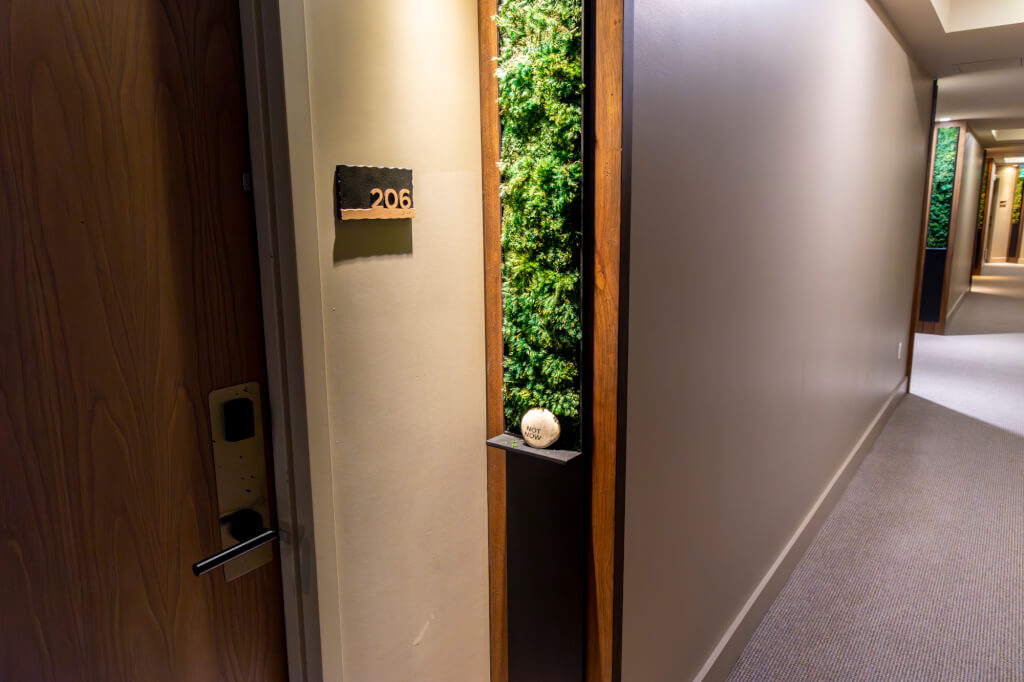 As you can see, the corridors here are quite interesting. Outside of each room is a moss wall, along with a little platform. From what we saw, each room might have a different item for its do not disturb sign. Ours was a rock, though we saw another room with a plant.